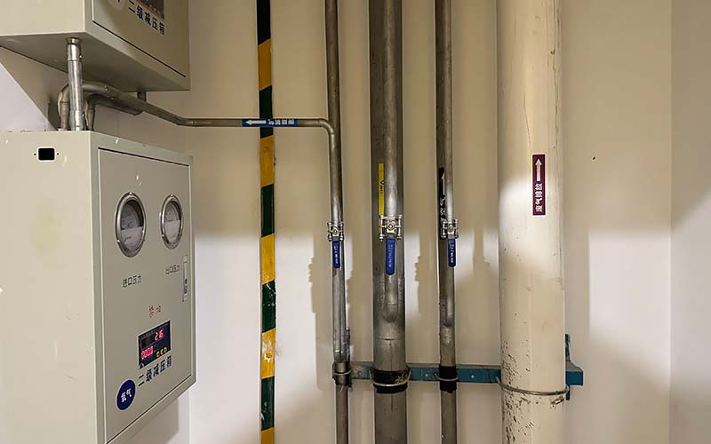 其四,标识与阀件。管井内每根立管均应有气体名称、流向箭头,阀门应设置于管井临检修门一侧,严禁暗埋在井壁内。氧气管道不得使用快开、快闭型阀门,手动阀门应缓开,操作位应设于阀杆侧面。